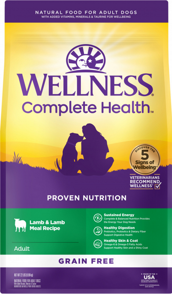 Wellness Grain Free Complete Health Adult Lamb & Lamb Meal Recipe Dry Dog Food includes carefully chosen ingredients for your dogs everyday health! This recipe has a wonderful balance of nutrient-dense ingredients such as Lamb, Menhaden Fish Meal, and Lamb Meal which optimizes nutrient absorption. Fruits and vegetables like apples, blueberries, spinach, and sweet potatoes are also used in this recipe which is crucial to provide your dog whole body nutritional support!