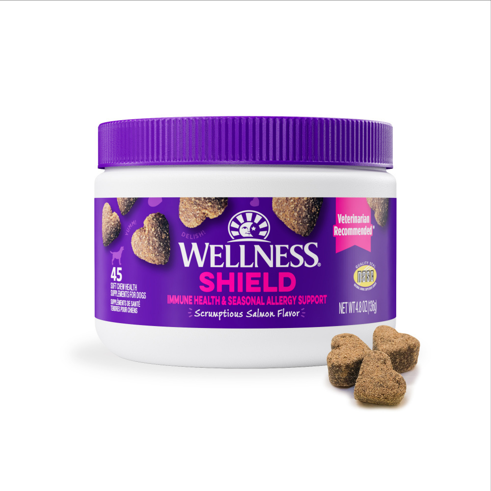 Wellness Shield Immune Health and Seasonal Allergy Support Soft Chews are NASC National Animal Supplement Council approved supplements that are scientifically formulated to support a healthy immune system and seasonal allergies and help maintain normal histamine levels for dogs. Its active ingredients help support a healthy immune system skin health pets with seasonal allergies healthy gut flora and immune system activity. Treat them well. Try Wellness Supplements to keep them healthy and happy. Scientifically formulated to support a healthy immune system and your pup’s seasonal allergies. Contains Antioxidants and prebiotics + probiotics to support a healthy immune system. Plus Omega 3 fatty acids that help support skin health and supports dogs with seasonal allergies. Tasty salmon flavor in a soft chew your dog will love with ingredients recommended by veterinarians