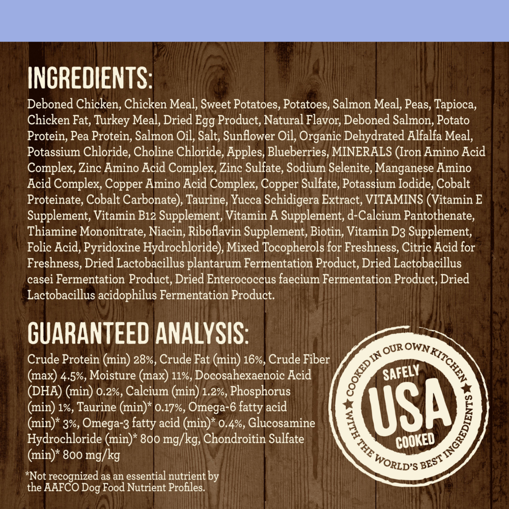 Deboned Chicken, Chicken Meal, Peas, Sweet Potatoes, Potatoes, Dried Egg Product, Chicken Fat, Pea Protein, Salmon Meal, Natural Flavor, Deboned Salmon, Sunflower Oil, Salmon Oil, Salt, Organic Dehydrated Alfalfa Meal, Potassium Chloride, Choline Chloride, Apples, Blueberries, Minerals (Iron Amino Acid Complex, Zinc Amino Acid Complex, Zinc Sulfate, Sodium Selenite, Manganese Amino Acid Complex, Copper Amino Acid Complex, Copper Sulfate, Potassium Iodide, Cobalt Proteinate, Cobalt Carbonate), Taurine, Yucca Schidigera Extract, Mixed Tocopherols for Freshness, Vitamins (Vitamin E Supplement, Vitamin B12 Supplement, Vitamin A Supplement, d-Calcium Pantothenate, Thiamine Mononitre, Niacin, Riboflavin Supplement, Biotin, Vitamin D3 Supplement, Folic Acid, Pyridoxine Hydrochloride), Citric Acid for Freshness, Dried Lactobacillus plantarum Fermentation Product, Dried Lactobacillus casei Fermentation Product, Dried Enterococcus faecium Fermentation Product, Dried Lactobacillus acidophilus Fermentation Product.