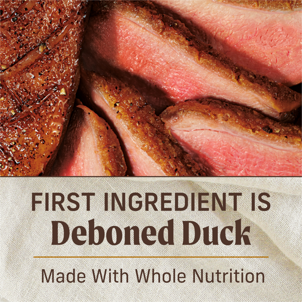 Serve your dog a high quality meal with Merrick Dog Food, Grain Free Wilderness Blend Recipe. This premium grain free dog food recipe is a canned wet dog food crafted with real deboned duck as the number one ingredient and contains high quality protein to support your dog’s lean muscle mass and healthy energy levels. Additionally, this wholesome, healthy dog food also contains venison and bison and is crafted with a holistic blend of soft carrots, peas, and potatoes all together in a savory gravy that adds flavor and moisture to your dog’s diet. Use this moist dog food as a topper for your dog’s dry kibble or as a delicious standalone meal your dog will love. Grain free and natural, with added vitamins and minerals, this real meat dog food is crafted without artificial flavors or preservatives. Merrick wet dog food is proudly founded in Hereford, Texas, crafted in USA facilities.