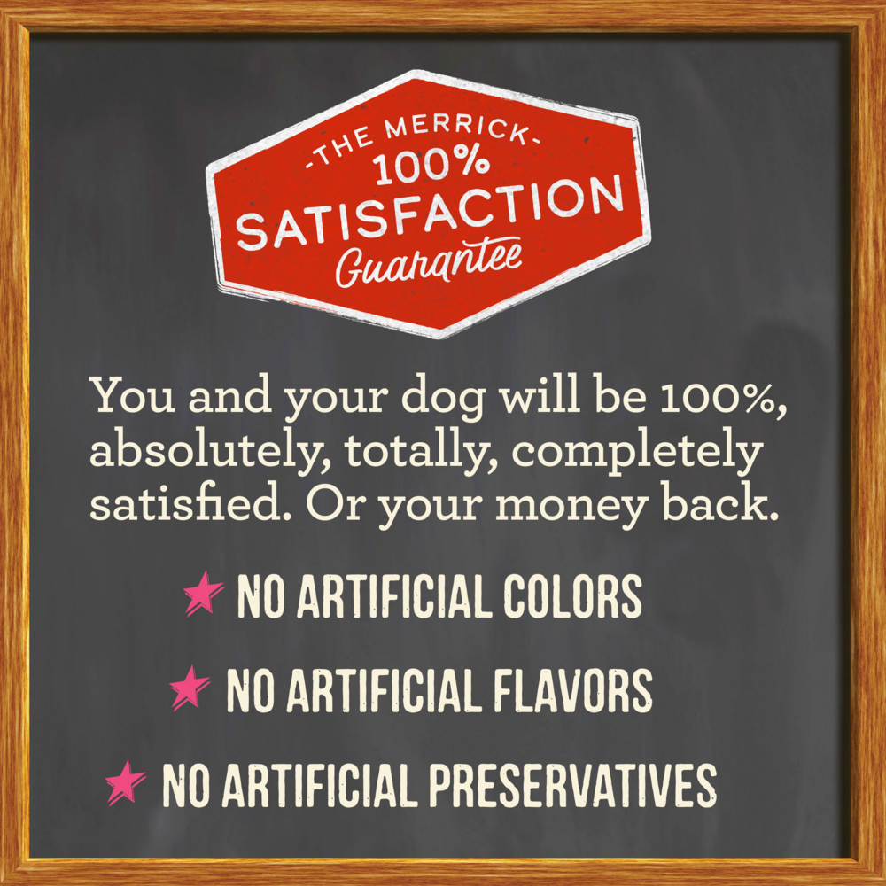 Merrick isn't your typical pet food company, and Merrick doesn't just make pet food. Merrick makes the best food ever for the best pet ever. Yours. The five star promise from Merrick is what's guaranteed to each and every dog and cat, along with their owners. Local growers, real whole foods, their own kitchen, balanced nutrition, and health you can see. Merrick creates real, wholesome recipes using USDA-inspected deboned meat and fresh produce for industry leading levels of protein, glucosamine and chondroitin. All of Merrick's foods are handcrafted in Hereford, Texas from USA farmers they know and trust. With no additives, sweeteners, colors or preservatives, real whole foods including high quality meats and fresh caught fish are the core of every Merrick dog and cat food. Merrick has been cooking their own foods in their own Texas kitchen for over 25 years. They stand behind their products with a 100% guarantee, promising that your dog or cat will be happier and healthier. You are what you eat, so why not feed your best friend the very best?