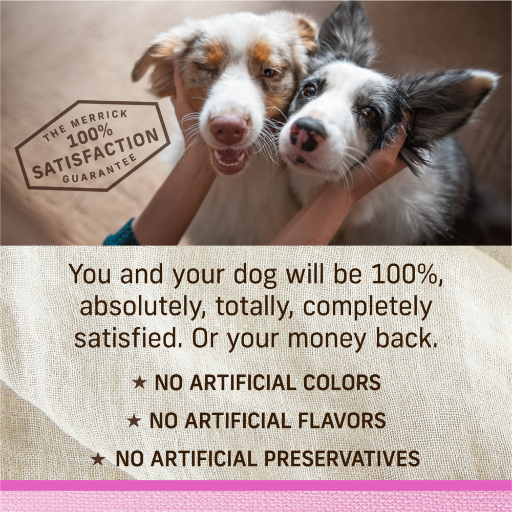 Merrick isn't your typical pet food company, and Merrick doesn't just make pet food. Merrick makes the best food ever for the best pet ever. Yours. The five star promise from Merrick is what's guaranteed to each and every dog and cat, along with their owners. Local growers, real whole foods, their own kitchen, balanced nutrition, and health you can see. Merrick creates real, wholesome recipes using USDA-inspected deboned meat and fresh produce for industry leading levels of protein, glucosamine and chondroitin. All of Merrick's foods are handcrafted in Hereford, Texas from USA farmers they know and trust. With no additives, sweeteners, colors or preservatives, real whole foods including high quality meats and fresh caught fish are the core of every Merrick dog and cat food. Merrick has been cooking their own foods in their own Texas kitchen for over 25 years. They stand behind their products with a 100% guarantee, promising that your dog or cat will be happier and healthier. You are what you eat, so why not feed your best friend the very best?