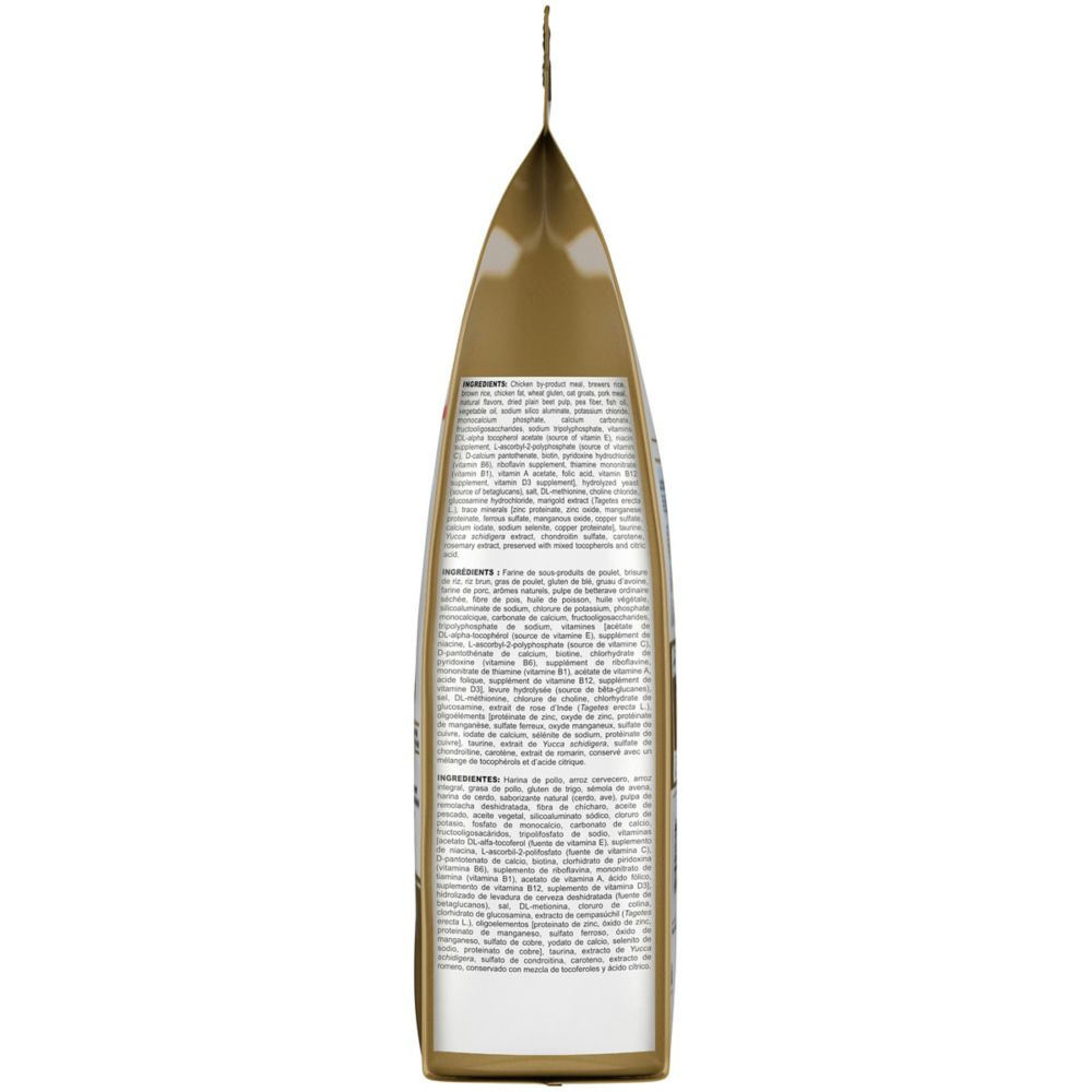 Chicken by-product meal, brewers rice, brown rice, chicken fat, wheat gluten, oat groats, pork meal, natural flavors, dried plain beet pulp, pea fiber, fish oil, vegetable oil, sodium silico aluminate, potassium chloride, monocalcium phosphate, calcium carbonate, fructooligosaccharides, sodium tripolyphosphate, vitamins [DL-alpha tocopherol acetate (source of vitamin E), niacin supplement, L-ascorbyl-2-polyphosphate (source of vitamin C), D-calcium pantothenate, biotin, pyridoxine hydrochloride (vitamin B6), riboflavin supplement, thiamine mononitrate (vitamin B1), vitamin A acetate, folic acid, vitamin B12 supplement, vitamin D3 supplement], hydrolyzed yeast (source of betaglucans), salt, DL-methionine, choline chloride, glucosamine hydrochloride, marigold extract (Tagetes erecta L.), trace minerals [zinc proteinate, zinc oxide, manganese proteinate, ferrous sulfate, manganous oxide, copper sulfate, calcium iodate, sodium selenite, copper proteinate], taurine, Yucca schidigera extract, chondroitin sulfate, carotene, rosemary extract, preserved with mixed tocopherols and citric acid.
