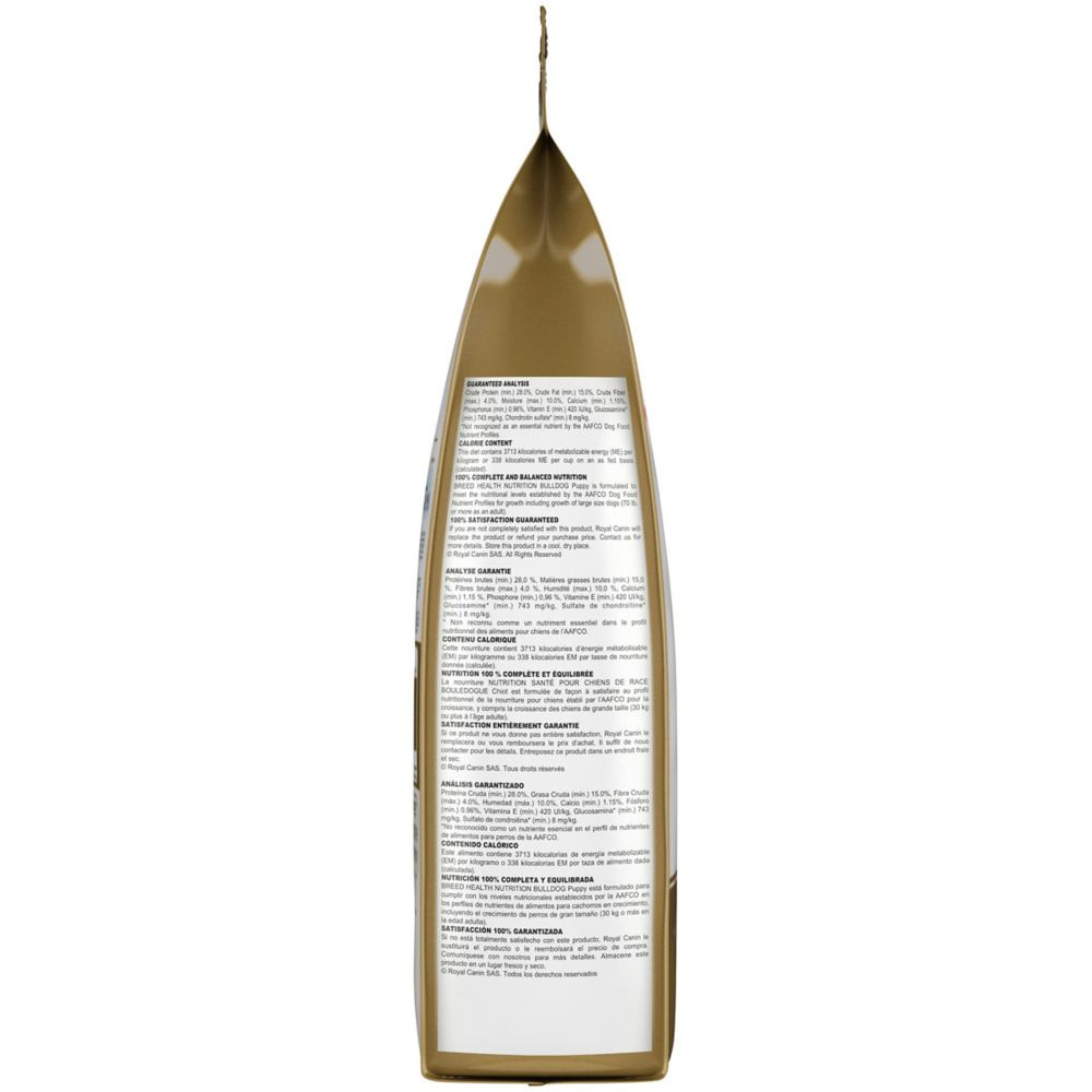 Royal Canin knows what makes your Bulldog puppy magnificent is in the details. With their funny, squishy faces, wrinkled skin, and short, stocky bodies, Bulldog puppies bring a lot of love—and smells—to your home. They can benefit from the right growth formula to provide immune system support, bone and joint health, and digestive care as they take on puppyhood. Royal Canin Bulldog dry puppy food is tailor-made nutrition created just for your pure breed Bulldog puppy. Whether you call yours an English Bulldog or British Bulldog, this exclusive breed-specific diet is uniquely formulated for your Bulldog puppy with specific nutrients to help them thrive. The unique wave-shaped kibble is specially designed for your Bulldog’s unique jaw, making it easy for them to pick up and chew. An exclusive mix of antioxidants and vitamin E supports their developing immune systems and keeps their body growing strong. High-quality proteins and prebiotics help promote optimal stool quality. And for healthy growth, this calcium- and phosphorus-fortified diet helps your Bulldog pup develop strong bones and healthy joints. Once your Bulldog puppy is over 15 months old, transition them to Royal Canin Bulldog Adult dog food for precise nutrition into the adult years. With nearly 50 years of scientific research and observation, Royal Canin continues to deliver targeted nutrition to feed every pet’s magnificence. Not satisfied? Then neither are we. Our breed health formulas are 100% satisfaction guaranteed. (Just contact us for more details.Royal Canin Bulldog Puppy dry dog food is designed to meet the nutritional needs of purebred Bulldogs 8 weeks to 15 months oldExclusive tailor-made kibble helps Bulldog puppies easily pick up and chew their foodHelps protect your puppy’s developing immune system and natural defenses with an exclusive complex of antioxidants including vitamin ESupports digestion and intestinal flora through high-quality proteins and prebiotics–which also helps with gas and stool qualityPromotes healthy growth for bones & joints with a balanced energy intake and precise minerals to support little stocky bodies.