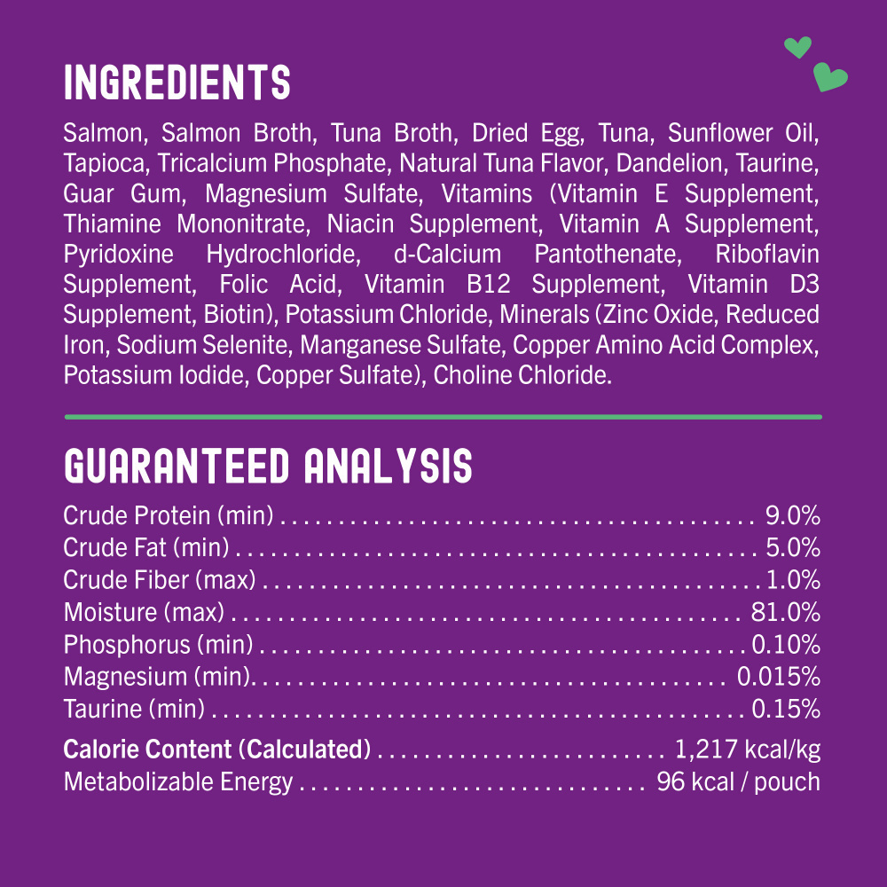 Salmon, salmon broth, tuna broth, dried egg, tuna, sunflower oil, tapioca, tricalcium phosphate, natural tuna flavor, dandelion, taurine, guar gum, magnesium sulfate, vitamins (vitamin E supplement, thiamine mononitrate, niacin supplement, pyridoxine hydrochloride, d-calcium pantothenate, riboflavin supplement, folic acid, vitamin B12 supplement, vitamin D3 supplement, biotin), potassium chloride, minerals (zinc oxide, reduced iron, sodium selenite, manganese sulfate, copper amino acid complex, potassium iodide, copper sulfate), choline chloride.