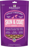 Boost your cat's diet with Stella's Solutions! Each of our 2 unique recipes offer complete & balanced nutrition that provide an extra boost to help proactively support pet health. Stella's Solutions recipes target digestive and skin & coat issues to keep your pet healthy and thriving!• SUPPLEMENT HEALTHY SKIN AND COAT for your cat with Stella's Solutions complete & balanced freeze-dried raw Dinner Mixers. This always-tasty cat food topper promotes skin health and a soft & shiny coat. Simply add to your cat’s favorite kibble or dry food and make mealtime extra special.• ALL-NATURAL, ACTIVE INGREDIENTS like salmon and salmon oil (to deliver high levels of omega 6 fatty acids and linoleic acid) for overall skin health, biotin for a safe natural boost for a shiny & healthy coat and chia seed that is rich in omega 3 fatty acid. Each recipe is grain-free, pea-free, lentil-free and potato-free. AND includes added taurine.• MADE IN THE USA in Stella & Chewy’s own kitchen with cage-free duck and wild-caught salmon. Each ingredient is responsibly sourced and never from China.• ALL-IN-ONE SUPPLEMENT AND FEEDING SOLUTION that helps with itchy skin relief for cats, overall skin & coat boost and adds the benefit of raw nutrition to a cat’s diet in one convenient cat food. BONUS: Even the pickiest eaters go wild for this topper!When used as a complete & balanced meal for adult cats: Stella's Solutions meet the nutritional requirements to be fed as a complete and balanced meal for adult cats. To use as a meal, serve as is, or rehydrate by adding cool or warm water. If your cat does not regularly drink water at mealtime, we recommend rehydrating by adding 1/2 cup of water per 1 cup of food. If your cat prefers dry food, always have ample fresh water available at mealtime. Number of cups per day* (When used as a complete meal): Body Weight (lbs.) Adult # of Cups 6 3/4 8 1 10 1 1/8 12 1 1/4 14 1 1/2 Number of cups per day* (When mixed with other food) Up to 10 lbs. 1/8 cup per day Over 10 lbs. 1/4 cup per day *Based on standard 8 oz. measuring cup Please note that these are guidelines, and individual requirements can vary by +/- 50% based on your pet's activity level, metabolism, age, general health, and other factors. More information on feeding guidelines is also available on our website.