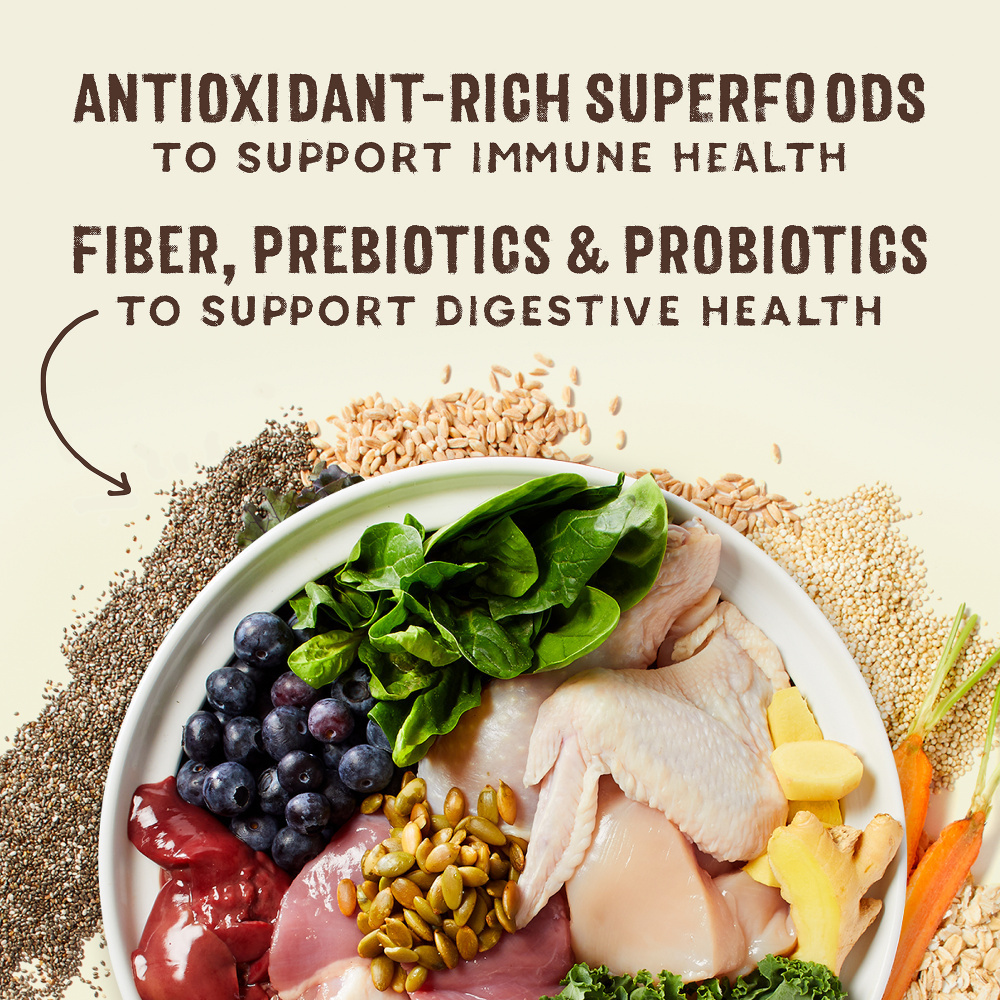Chicken, chicken meal, oatmeal, barley, chicken fat, duck, flaxseed, tomato pomace, quinoa, natural chicken flavor, chicken liver, chicken gizzard, organic blueberries, organic broccoli, organic beets, organic carrots, organic spinach, organic squash, organic cranberries, chia seed, pumpkin seeds, sunflower oil, salmon oil, taurine, chicory root (source of inulin), kale, pumpkin, ginger, turmeric, dried kelp, tocopherols (preservative), rosemary extract, chicken bone broth, ascorbic acid (vitamin C), L-Carnitine, New Zealand green mussel, salt, potassium chloride, calcium carbonate, dicalcium phosphate, thiamine mononitrate, vitamin E supplement, niacin supplement, d-calcium pantothenate, riboflavin supplement, vitamin A supplement, vitamin B12 supplement, vitamin D3 supplement, pyridoxine hydrochloride, folic acid, zinc proteinate, iron proteinate, copper proteinate, manganese proteinate, calcium iodate, sodium selenite, dried Pediococcus acidilactici fermentation product, dried Lactobacillus acidophilus fermentation product, dried Bifidobacterium longum fermentation product, dried Bacillus coagulans fermentation product.