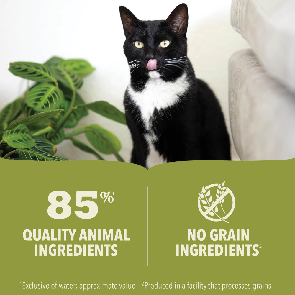 • High protein cat food thoughtfully crafted with 85% animal ingredients** and no grains*** to nourish and satisfy your cat completely with every bite