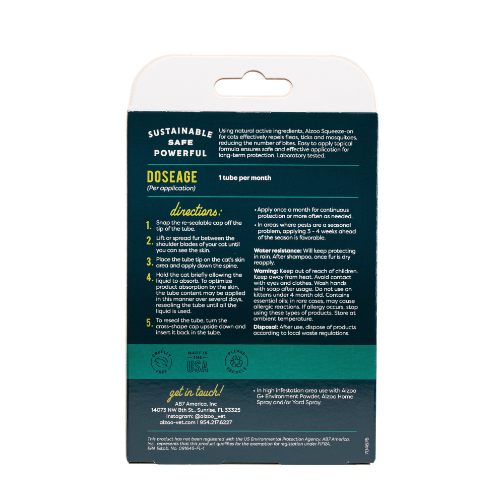 NATURAL REPELLENT AND PREVENTIVE - NO PESTICIDE. The Alzoo Flea & Tick Squeeze-On utilizes natural active ingredients to effectively repels fleas, ticks and mosquitoes, reducing the number of bites.SUSTAINABLE, SAFE & POWERFUL. Safe for pets and people when used as directed. Laboratory tested. Cruelty free, made in the USA using recycled and recyclable packaging.DURABLE & EASY TO APPLY. Effectively repels fleas, ticks and mosquitos for up to 3 months. 3 applicators enclosed, use 1 per month. Easy to apply topical formula ensures safe and effective application for long-term protection.WATER RESISTANT. Will keep protecting in rain or after a brief swim. After shampoo, once fur is dry re-apply.COMBINABLE. If your dog currently has fleas, use with Alzoo F&T Shampoo & Alzoo F&T Spray. In high infestation area use with Alzoo G+ Environment Powder, Alzoo F&T Home Spray and/or Alzoo F&T Yard Spray. Variety of SKUs in the F&T line to please users who prefer one type of product or another.SEASON PREVENTION: In areas where pest are a seasonal problem, applying 3-4 weeks ahead of the season is favorable.