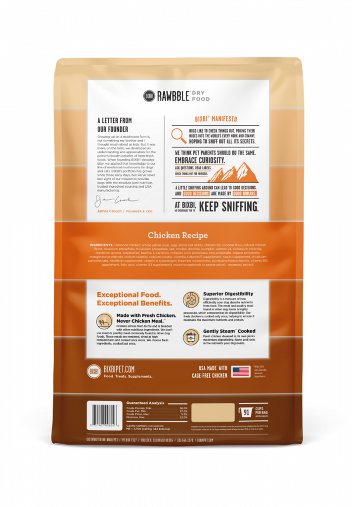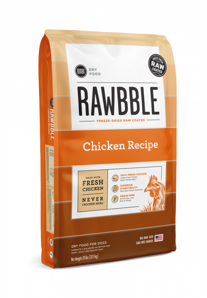 Our Freeze Dried Raw coated, fresh meat, no meat meals dry dog food line RAWBBLE® was developed with your dog's health in mind. We selected ingredients for gut, renal and colon health while maintaining the awesome flavor you and your pup have come to know from BIXBI. Protein from fresh chicken, and carbohydrates from lentils and whole peas replace commonly found ingredients like meals, pea protein powder, potato or rice. This new low glycemic diet optimizes amino acid absorption, offers balanced fiber levels and presents the right quality and quantity of fresh meat proteins.