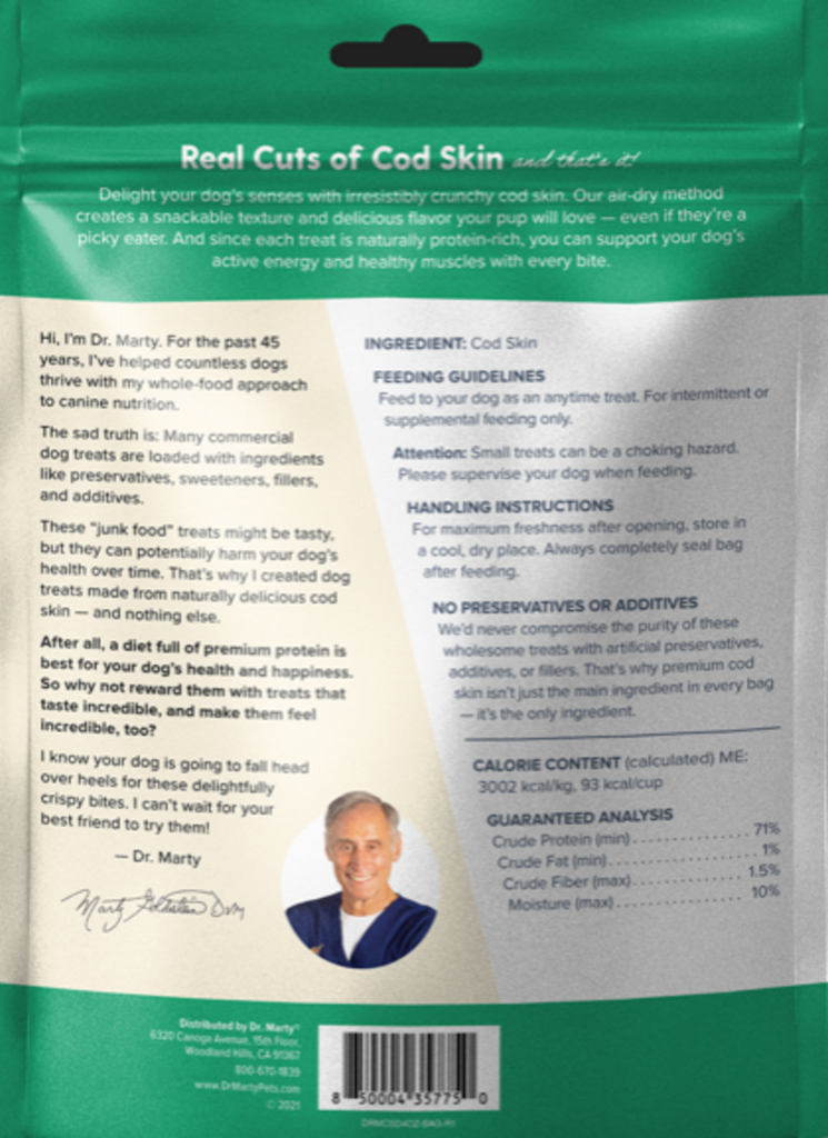 Cod skin singlle ingredient dog treatWhy We Love It Freeze dried raw High protein No additives or preservatives About Dr. MartyAmerica?s Foremost Integrative VeterinarianFor more than four decades,...