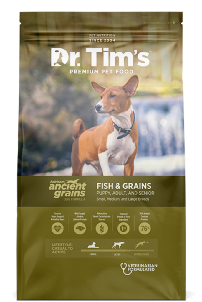 'Dr. Tim’s Heirloom Ancient Grains Fish Formula is for the sedentary tomoderately active dog and supports a casual lifestyle by working inconjunction with your dog’s natural metabolism. Genetically unchangedfor thousands of years, millet, quinoa, spelt, and chia boost the minerals,proteins, fiber, and healthy fats in this metabolically balanced formula.Our probiotics and antioxidants help enhance your dog’s immunesystem and help promote a natural gut microbiome, and Omega 3 fattyacids in the form of EPA and DHA may boost mental clarity, diminishinflammation, and give your dog’s coat a beautiful shine. Ancient grainsare functional ingredients, too, which may help promote health andboost energy. Terrific for sensitive dogs, Ancient Grains Fish Formula isa great alternative to grain-free and grain-inclusive diets because thegrains are unmodified.'