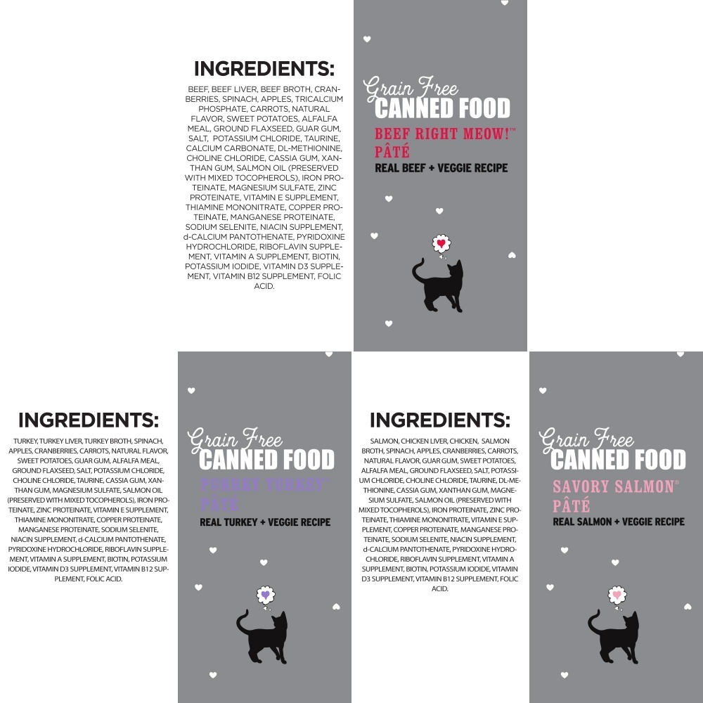 'They say “Variety is the spice of life” and we wholeheartedly agree. Snag this savory pack of chunky and moist canned pâté to keep mealtime exciting for your cat. Featuring chicken, salmon and your adventurous and flavor-obsessed cat gets a little bit of land and a little of sea throughout the week. While all of our pâté options are abso-freakin-lutely delicious, they also pack an extra functional punch thanks to the handpicked ingredients. Ya welcome. Beef Right Meow! (4 cans): Don’t have to ask us twice! Savory Salmon (4 cans): Ohlala, a meal to remember… Purrky Turkey (4 cans): “Purrky Turkey” translated in cat is “Please can I have some more freaking turkey?” FRIENDLY PSA: This product is complete & balanced, I.E. Unlike some other brands—we didn’t cut any nutritional corners. So, each serving has the proper amount of vitamins and minerals for your growing kitten, adult or senior cat, according to our friends at AAFCO.