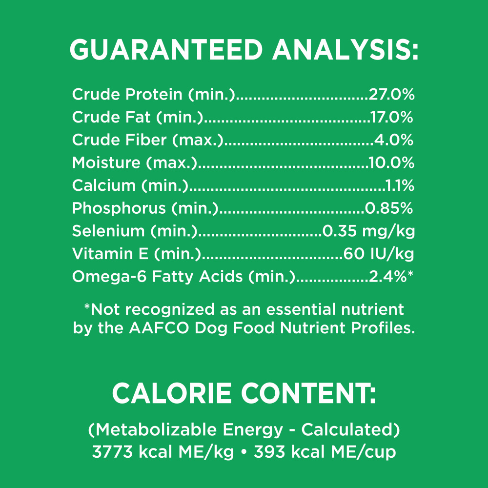 INGREDIENTS: Chicken, Chicken By-Product Meal, Ground Whole Grain Corn, Ground Whole Grain Sorghum, Dried Plain Beet Pulp, Chicken Fat (Preserved with Mixed Tocopherols), Natural Flavor, Brewers Dried Yeast, Dried Egg Product, Flaxseed, Caramel Color, Sodium Hexametaphosphate, Potassium Chloride, Carrots, Calcium Carbonate, Choline Chloride, Fructooligosaccharides, Mixed Tocopherols (Preservative), Vitamins (Vitamin E Supplement, Ascorbic Acid, Calcium Pantothenate, Biotin, Thiamine Mononitrate (source of Vitamin B1), Vitamin B12 Supplement, Vitamin A Supplement, Niacin, Riboflavin Supplement (source of Vitamin B2), Pyridoxine Hydrochloride (source of Vitamin B6), Vitamin D3 Supplement, Folic Acid), Minerals (Ferrous Sulfate, Zinc Oxide, Sodium Selenite, Manganese Sulfate, Manganous Oxide, Potassium Iodide), Rosemary Extract