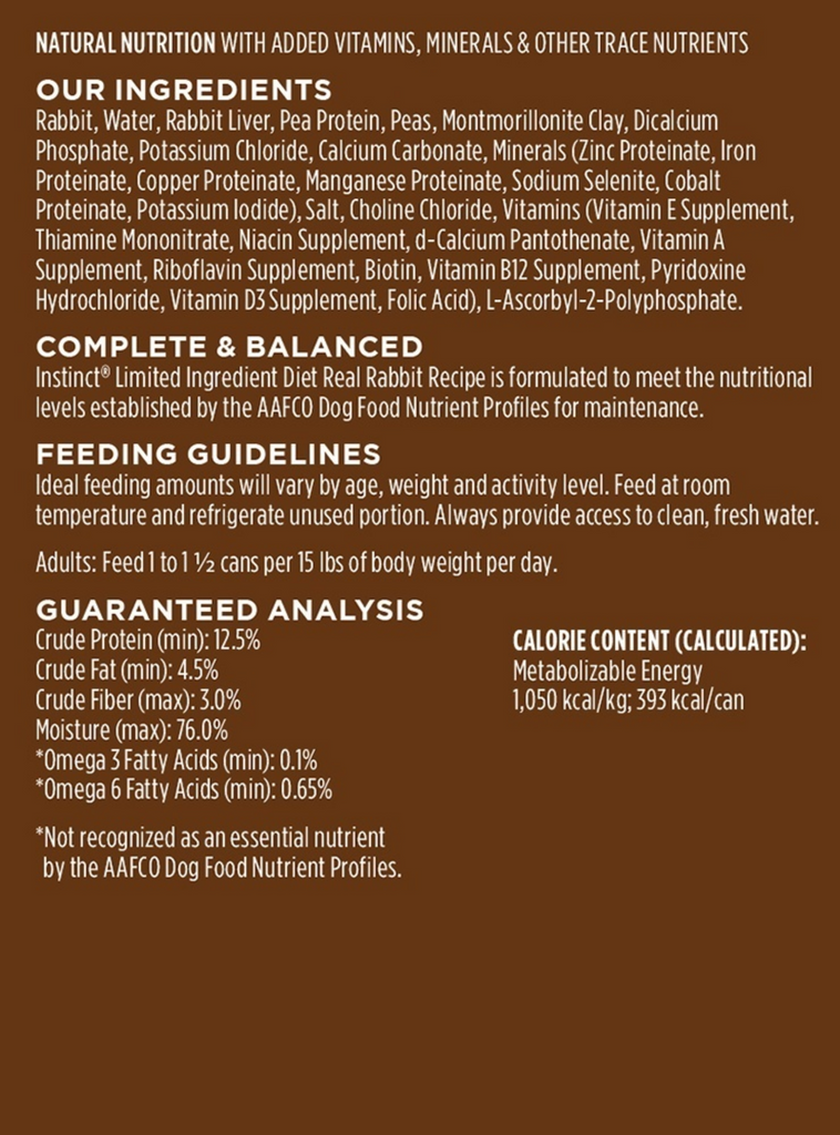 Sensitive digestive systems can be difficult to manage. Nature's Variety is here to help, with Instinct Grain-Free LID Rabbit Canned Dog Food. Made with one single animal protein, high quality rabbit, and highly digestible, simple ingredients, feel good knowing your dog is eating a simple, digestible diet. Free of grains and gluten for extra digestibility, and balanced for all life stages, Instinct LID features only recognizable ingredients in grain-free formulas.
