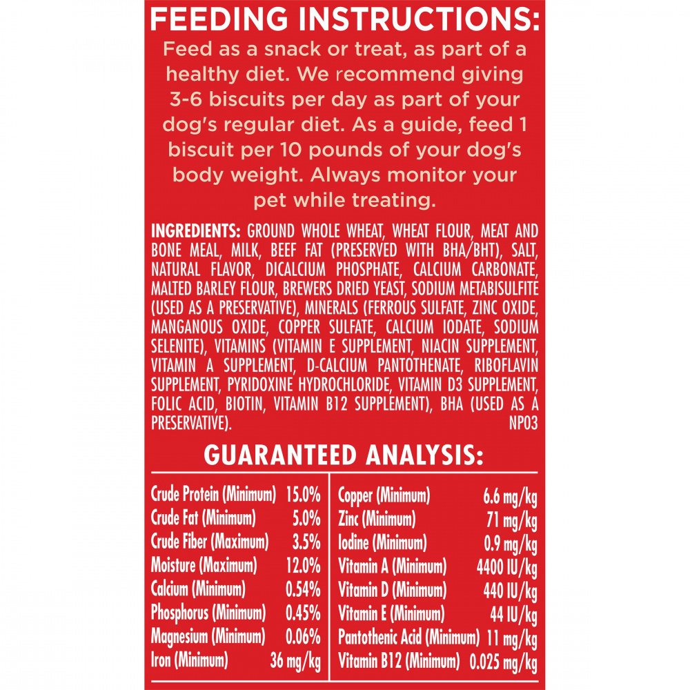 Make your dog's life more fun with delicious dog snacks from a brand you can trust. Milk-Bone Original dog biscuits are prepared with care and will give your dog the simple, genuine joy that your dog gives you every day. How? A classic crunch with a wag-worthy taste — now with even MORE meaty taste compared to the Milk-Bone Original biscuits you know and love. Better yet, the crunchy texture of Milk-Bone dog biscuits helps freshen dogs' breath and reduce tartar build-up, so you can fully enjoy all those sloppy doggie kisses. These tasty dog treats even contain vitamins and minerals — 12, to be exact. So you'll be almost as happy to give them as your dog is to get them … almost.