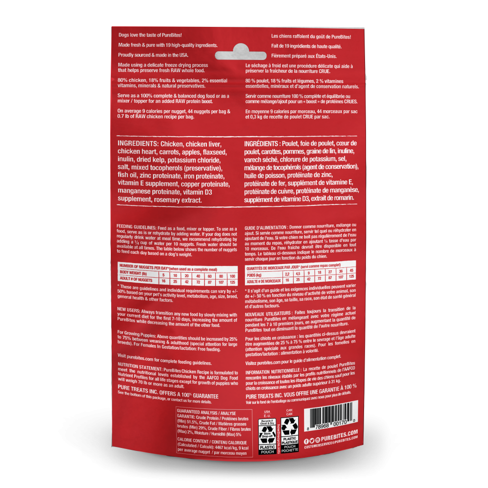 At PureBites, we're always asking pet parents to Go ahead, look at our ingredients. Simplicity and the high-quality ingredients we choose to feed our family makes a difference. At PureBites this means every member of our family. PureBites RAW freeze dried chicken recipe is the ultimate single protein source, limited ingredient dog food, mixer, or topper. Made with only 19 simple human grade ingredients you can read, pronounce, and trust: 80% pure chicken , 18% carrot & apple, and 2% essential vitamins, minerals, & natural preservatives. Nothing else. No artificial colors, fillers, or sweeteners. Proudly sourced and made in the USA using a delicate freeze drying process that helps preserve fresh RAW whole food, locking in the taste dogs crave and the high protein / low calorie nutrition that pet parents love. PureBites freeze dried chicken recipe can be fed as a complete & balanced dog food or as a compliment to a RAW diet since it retains many of the benefits of RAW without the hassle of refrigeration.