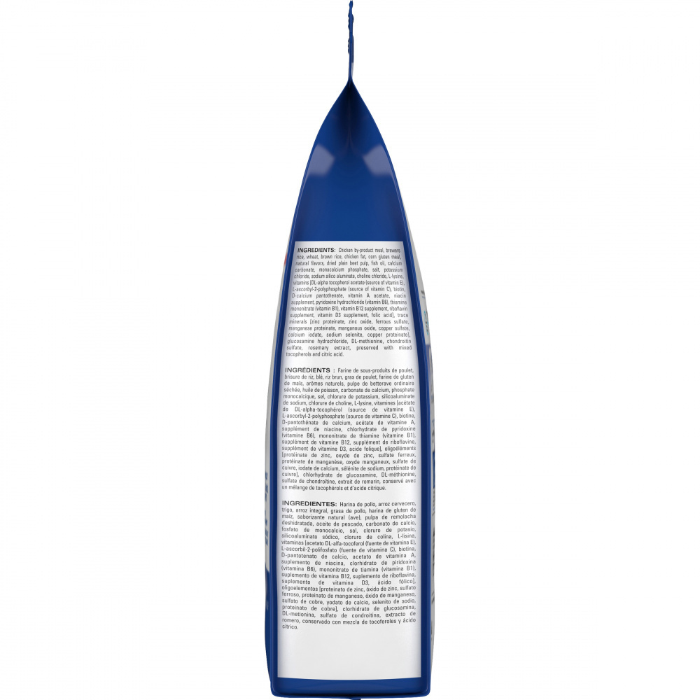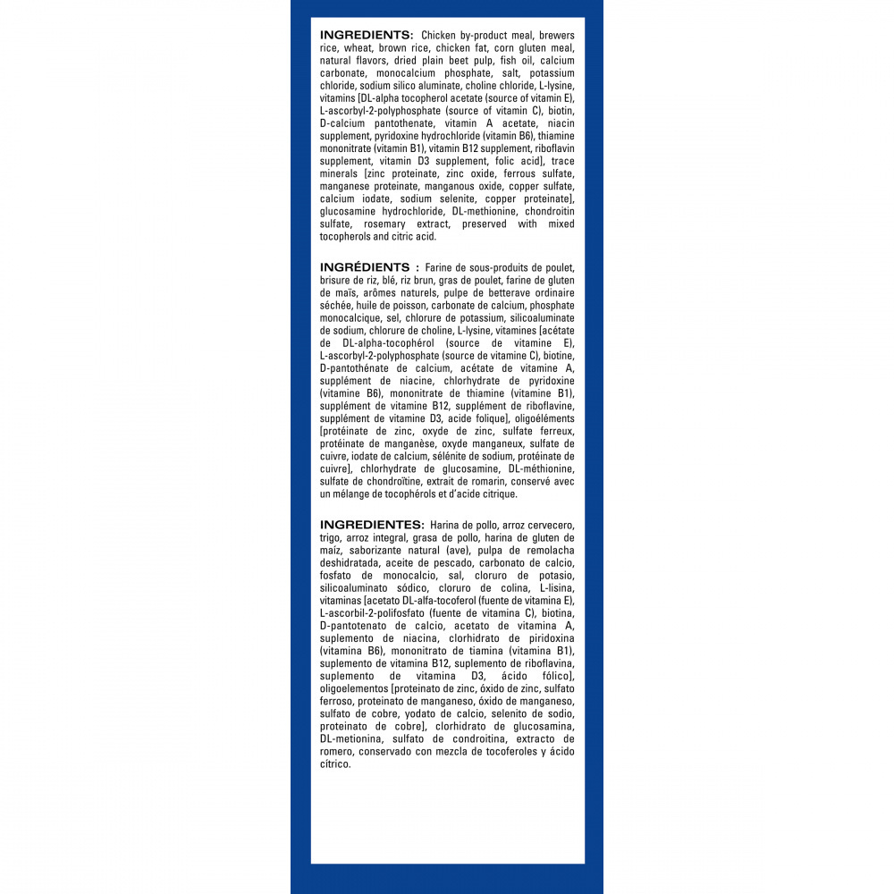 Chicken by-product meal, brewers rice, wheat, brown rice, chicken fat, corn gluten meal, natural flavors, dried plain beet pulp, fish oil, calcium carbonate, monocalcium phosphate, salt, potassium chloride, sodium silico aluminate, choline chloride, L-lysine, vitamins [DL-alpha tocopherol acetate (source of vitamin E), L-ascorbyl-2-polyphosphate (source of vitamin C), biotin, D-calcium pantothenate, vitamin A acetate, niacin supplement, pyridoxine hydrochloride (vitamin B6), thiamine mononitrate (vitamin B1), vitamin B12 supplement, riboflavin supplement, vitamin D3 supplement, folic acid], trace minerals [zinc proteinate, zinc oxide, ferrous sulfate, manganese proteinate, manganous oxide, copper sulfate, calcium iodate, sodium selenite, copper proteinate], glucosamine hydrochloride, DL-methionine, chondroitin sulfate, rosemary extract, preserved with mixed tocopherols and citric acid.