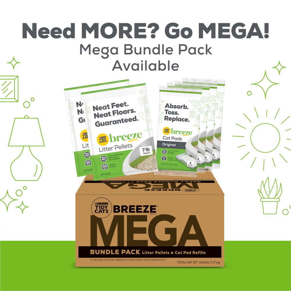 Change the way you think about cleaning your cat's litter box with the Purina Tidy Cats BREEZE With Ammonia Blocker Litter System starter kit. This system features powerful odor control to keep your house smelling fresh and clean, and the specially designed, cat-friendly litter pellets minimize your pets from tracking litter throughout your home. With the pass-through automatic litter box system, the pellets capture solid waste on top, letting urine pass through to the absorbent litter pads below, while the Ammonia Blocker in each pad is guaranteed to prevent ammonia odor for 7 days for one cat. This easy-to-maintain system takes the guesswork out of changing litter while giving your cats a comfortable place to seek relief. A protective drawer holds the cat pads for litter box use securely in place, keeping them away from your cats while they use the BREEZE litter box. The Purina Tidy Cats BREEZE With Ammonia Blocker Litter System starter kit comes with everything you need to get your cats started on this convenient and odor-controlling all-in-one cat litter system.The Purina Tidy Cats BREEZE With Ammonia Blocker Litter System starter kit for multiple cats filters solid waste for easy removal, and the included scoop helps you to get the job done. The included litter pads fit neatly in the integrated drawer to contain messes, and each absorbent pad is disposable for quick and convenient cleanup. With 99.9% dust-free anti-tracking pellets, this odor control litter system offers a virtually dust-free option to help you keep your home clean and avoid those messy paw prints on your floors. The pads feature Ammonia Blocker that is guaranteed to prevent ammonia odor for 7 days for one cat, and a removable sidewall helps to keep the litter pellets contained as your cat gets used to using her new litter box. Because this Purina Tidy Cats BREEZE With Ammonia Blocker all-in-one litter system for multiple cats separates solid waste from urine, it delivers outstanding odor control while keeping your feline friends dry and comfortable. Urine is quickly absorbed to minimize odors for up to one week, leaving your home with a fresh, clean scent. To get the most out of your BREEZE starter kit, we recommend one system per cat in your home, as well as one additional system. Each bag of BREEZE 99.9% dust-free litter pellets lasts for one month of fresh filtering power. We know you care about your cat's well-being, which is why our litter pellets are cat-friendly for added peace of mind. This BREEZE With Ammonia Blocker litter system lets you welcome guests into your home with no worries about overpowering odors. The system is easy to set up, and the absorbent pads and 99.9% dust-free pellets are sold separately to help you maintain your BREEZE cat litter box. Each Purina Tidy Cats BREEZE With Ammonia Blocker Litter System starter kit comes with one litter box, one scoop, one bag of BREEZE litter pellets and four absorbent pads, making it easy to begin transitioning your cats right away.